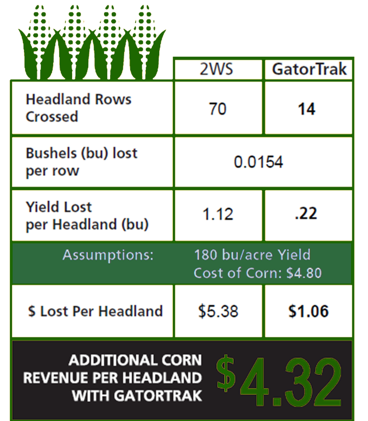 No caso de não haver cabeceiras, uma máquina 2WS padrão pode exigir uma volta de três pontos após cada passada. Se cada curva leva em média 18 segundos e um campo médio tem 32 hectares, eliminando essa tarefa demorada e tediosa, o GatorTrak permite percorrer 40 hectares adicionais por dia e 1.820 hectares a mais todos os anos.