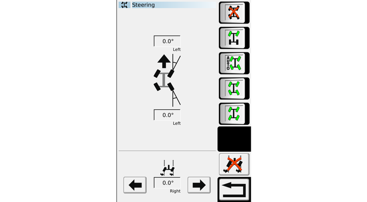 Direção “Caranguejo”: As rodas traseiras giram na mesma direção que as dianteiras, permitindo que a máquina se mova horizontalmente em operações em terrenos íngremes, mantendo as rodas fora da linha. Também é ótimo para mudar de lado e evitar obstáculos, mantendo uma cobertura precisa e uniforme.