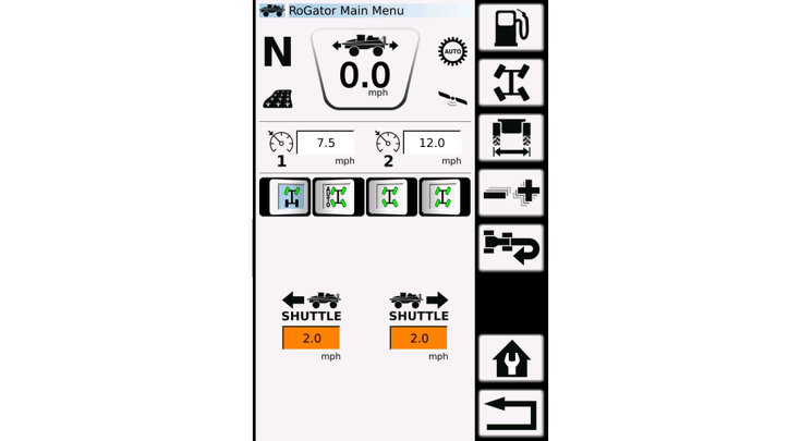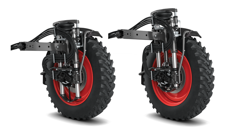 Direção automática nas 4 rodas: O eixo traseiro segue o eixo dianteiro quando as curvas ultrapassam seis graus, permitindo que o RoGator opere como uma máquina 2WS padrão em linhas.